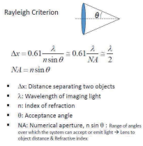 delta x는 구분이 가능한 물체 사이의 최소 미소 거리를 의미한다. 식을 보면 빛의 파장이 짧을수록 즉, 에너지가 큰 빛일수록 물체를 구분지을 수 있는 거리가 최소가 될 수 있음을 알 수 있다.