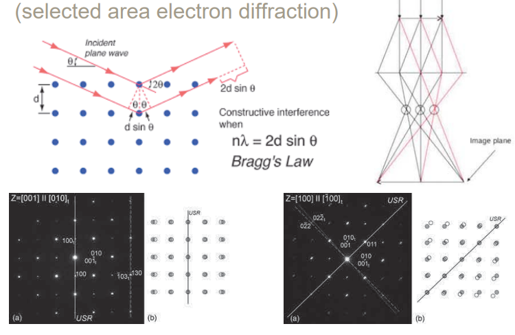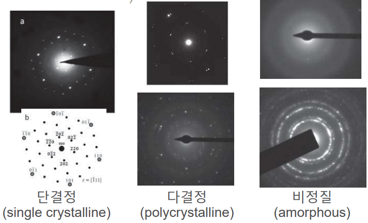 결정성을 갖는 물질은 어떤 전자기빔이 오면 결정에 의해서 특정방향으로 반사가 일어난다. 결정이 아닌 경우는 난반사가 일어난다. 왼쪽과 오른쪽은 TEM을 이용하여 물질의 SAED 현상을 관측한 것이다.