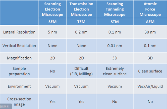 - Sample preparation은 샘플 준비의 난이도를 나타낸다. TEM은 전자가 뚫고 지나가도록 샘플을 자르고 갈아야해서 매우 복잡하다. STM과 AFM은 탐침을 이용하므로 표면이 끈적이지 않아야 한다.