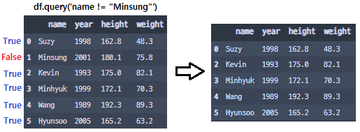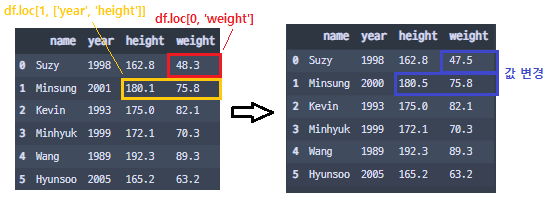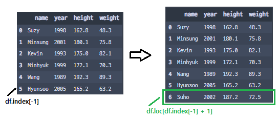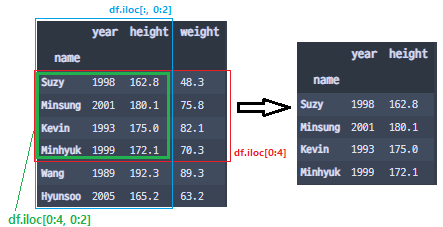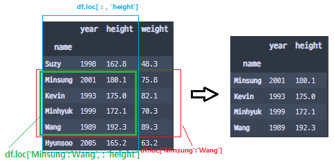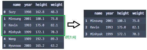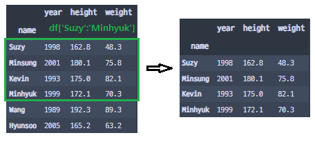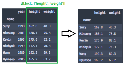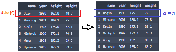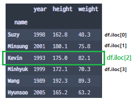 - 기존 인덱싱 방식 혹은 loc, iloc를 이용하여 조회가 가능하다.