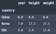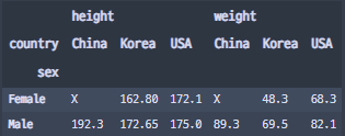 - China 국적의 여성 값이 없기에 해당 평균은 Nan값이며, fill_value로 인해 Nan값이 'X'로 치환되었다.