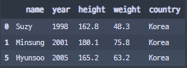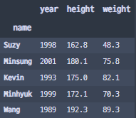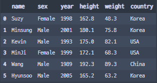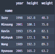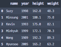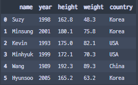 'name': ['Suzy', 'Minsung', 'Kevin', 'Minhyuk', 'Wang', 'Hyunsoo'],