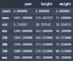 'height': [162.8, 180.1, 175.0, 172.1, 192.3, 165.2],